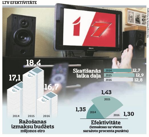 Tā, piemēram, saskaņā ar informāciju, kas pieejama LTV gada pārskatos, var konstatēt, ka LTV ražošanas izmaksu budžets 2014. gadā bija 17,1 miljons eiro, 2015. gadā tas pieauga līdz 18,4 miljoniem, savukārt 2016. gadā nokritās līdz 16,7 miljoniem eiro. Tomēr auditorijas skatīšanās laika daļa faktiski nemainījās - tā šo trīs gadu laikā svārstījās no 12,7 līdz 12,9.
