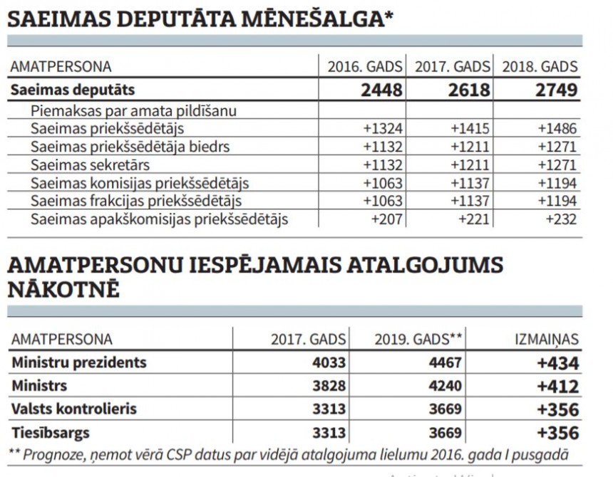 Saeimas deputātu un amatpersonu atalgojumu nosaka atkarībā no aizpagājušā gada vidējās algas valstī, piemērojot katram amatam attiecīgu koeficientu (piemēram, premjerministram tas ir 4,93; ministriem - 4,68; valsts kontrolierim un tiesībsargam - 4,05; Saeimas deputātiem - 3,2). Tātad amatpersonu 2018. gada algas aprēķinam tiks izmantoti 2016. gada dati par vidējo algu valstī.