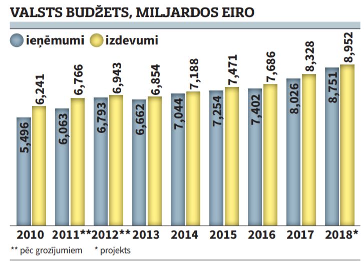 1998. gada valsts budžeta plānotie ieņēmumi bija 1,7 miljardi eiro (1,21 miljards latu), izdevumi - 1,8 miljardi eiro (1,28 miljardi latu). Tātad 20 gadu laikā valsts budžets ir kļuvis piecas reizes lielāks. Savukārt, salīdzinot ar šā gada budžetu, nākamgad plānotie ieņēmumi paredzēti par 725 miljoniem eiro lielāki, izdevumi - par 625 miljoniem eiro lielāki nekā 2017. gada valsts budžeta likumā - tātad ir cerība uz budžeta deficīta samazinājumu.