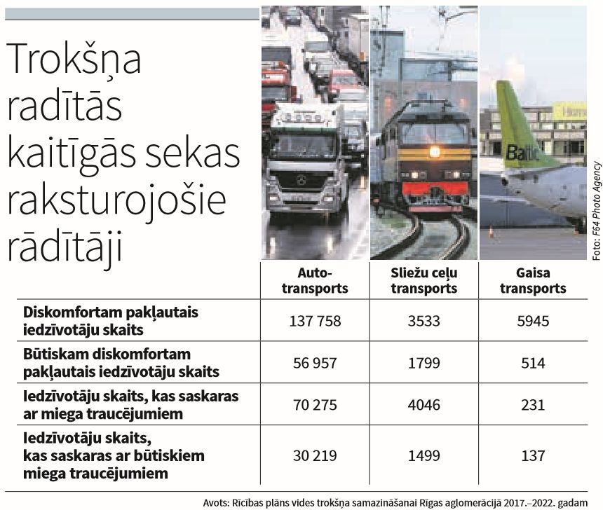Trokšņa radīto kaitīgo seku novērtējumā konstatēts, ka nozīmīgāko ietekmi uz iedzīvotāju veselību Latvijas galvaspilsētā rada autotransporta radītais troksnis, bet atsevišķās teritorijās nozīmīgāko ietekmi rada aviosatiksme un sliežu ceļu transports.