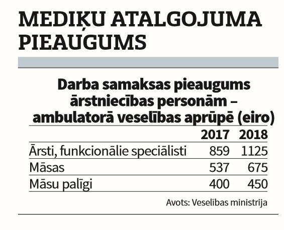 Ņemot vērā papildus piešķirtos līdzekļus, 2018. gadā ārstu un funkcionālo speciālistu darba samaksu plānots palielināt no 859 eiro līdz 1125 eiro mēnesī, ārstniecības un pacientu aprūpes personām un funkcionālo speciālistu asistentiem no 537 eiro līdz 675 eiro mēnesī, bet ārstniecības un pacientu aprūpes atbalsta personām - no 400 eiro līdz 450 eiro mēnesī. Savukārt stacionārajās iestādēs saistībā ar obligātajām piemaksām par diennakts darba režīmu un pagarinātā normālā darba laika pakāpenisku atcelšanu ārstniecības personu darba samaksa palielināsies vairāk - ārstiem un funkcionālajiem speciālistiem - līdz 1547 eiro, ārstniecības un pacientu aprūpes personām un funkcionālo speciālistu asistentiem - līdz 929 eiro un ārstniecības un pacientu aprūpes atbalsta personām - līdz 621 eiro.