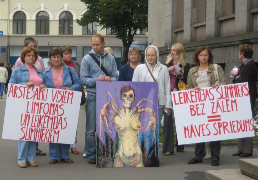 Leikēmijas un limfomas pacientu atbalsta biedrības rīkotajā piketā pie valdības ēkas šodien pulcējās ap divdesmit biedrības pacientu, kuri valdības pārstāvjiem uzdāvināja Kristiana Brektes gleznu Leikēmija: neārstēta.
