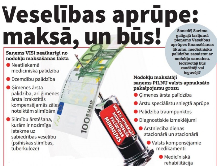 Pats veselības apdrošināšanas princips, pēc politiķu domām, jau būs spēkā, tiklīdz likumu izsludinās Valsts prezidents, jo likums paredz avotus, no kā tiek finansēta veselības aprūpe, un viens no avotiem ir sociālais budžets. Jau no 2018. gada 1. janvāra viens procents no katra nodokļu maksātāja sociālajām iemaksām nonāks veselības aprūpes makā. Turklāt šis likums nosaka arī veidus, kā cilvēks, kas nav maksājis nodokļus, tagad var samaksāt par veselības apdrošināšanu. Pirmkārt, sākt maksāt sociālās iemaksas vismaz no minimālās algas (tas ir, iekļaujoties sociālās apdrošināšanas sistēmā), otrkārt, veikt speciālas veselības apdrošināšanas iemaksas, kuru apmērs sākotnēji šķiet neliels un «nevainīgs», taču ar katru gadu maksājamā summa pieaug.