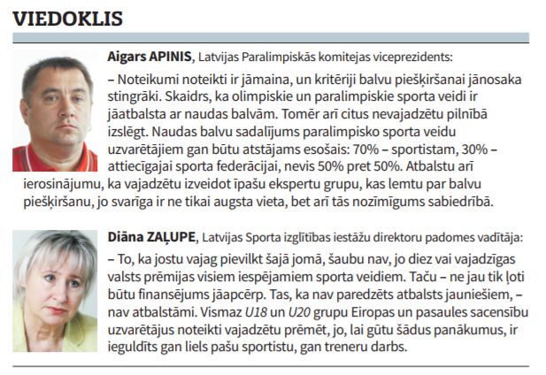 - Noteikumi noteikti ir jāmaina, un kritēriji balvu piešķiršanai jānosaka stingrāki. Skaidrs, ka olimpiskie un paralimpiskie sporta veidi ir jāatbalsta ar naudas balvām. Tomēr arī citus nevajadzētu pilnībā izslēgt. Naudas balvu sadalījums paralimpisko sporta veidu uzvarētājiem gan būtu atstājams esošais: 70% - sportistam, 30% - attiecīgajai sporta federācijai, nevis 50% pret 50%. Atbalstu arī ierosinājumu, ka vajadzētu izveidot īpašu ekspertu grupu, kas lemtu par balvu piešķiršanu, jo svarīga ir ne tikai augsta vieta, bet arī tās nozīmīgums sabiedrībā.