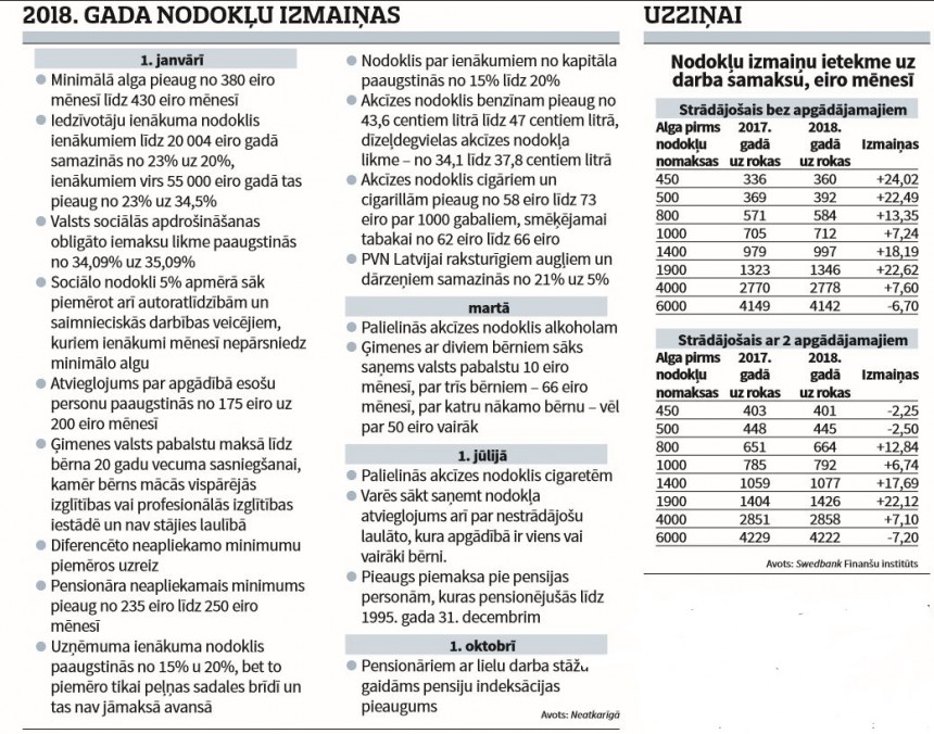 Līdz ar jaunā gada pirmo dienu spēkā stājušies 172 tiesību akti, 48 likumi un 71 Ministru kabineta noteikumi. Tie lielākā vai mazākā mērā ietekmēs ikviena Latvijas iedzīvotāja ikdienu. Lielākajai daļai strādājošo algas izmaksas dienā maciņš izskatīsies biezāks nekā pērn, taču arī tā saturs, visticamāk, dils straujāk nekā 2017. gadā.