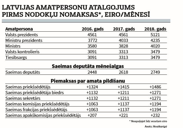 Šogad labāk atalgoti būs ne tikai minimālas algas saņēmēji, bet arī valsts augstākās amatpersonas, kuru algas pieaugs par vairākiem simtiem eiro mēnesī. Tiesa, uz kaimiņvalstu fona Latvijas valsts vadītāji šobrīd saņem visai pieticīgu atalgojumu.