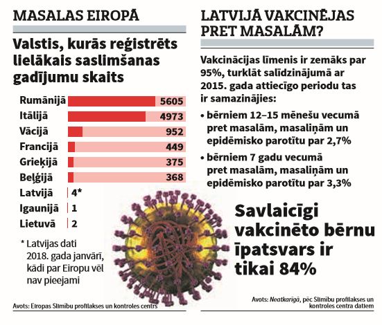 Eiropas Slimību profilakses un kontroles centrs (ECDC) pagājušā gada decembra masalu uzraudzības datu pārskatā ziņo par 13 726 masalu gadījumiem, kas tika reģistrēti no 2016. gada novembra līdz 2017. gada 31. oktobrim 30 Eiropas Savienības dalībvalstīs. Par masalu saslimšanas gadījumiem pēdējo 12 mēnešu laikā ziņots visās valstīs, izņemot Latviju un Maltu. Visvairāk gadījumu reģistrēts Rumānijā (5605), kur mēnesī epidemiologi reģistrē no simts līdz pat 1000 gadījumiem, tad Itālijā (4973) un Vācijā (952). Rumānijā reģistrēts 41 procents no visiem Eiropā atklātajiem masalu gadījumiem, bet Itālijā - 36 procenti. Vairāk nekā simts masalu saslimušo reģistrēts arī Beļģijā, Francijā, Spānijā, Lielbritānijā, Grieķijā, Čehijā, Horvātijā. Ziemeļeiropas valstīs un Baltijā saslimušo nav daudz. Līdz šim Latvija uz šīs epidemioloģiskās kartes iezīmējās kā viena no divām valstīm, kur saslimušo ir nulle.