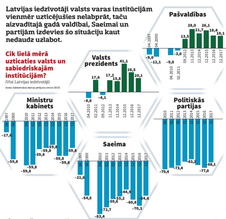 Latvijas iedzīvotāji valsts varas institūcijām vienmēr uzticējušies nelabprāt, taču aizvadītajā gadā valdībai, Saeimai un partijām izdevies šo situāciju kaut nedaudz uzlabot. Ar to gan nevar lepoties Valsts prezidents Raimonds Vējonis, kura vadītajai prezidentūrai otro gadu pēc kārtas sarucis uzticību paudošo iedzīvotāju īpatsvars.