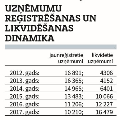 Pagājušais gads būtiskas izmaiņas jaunu uzņēmumu reģistrēšanas un likvidēšanas līknēs nav nesis - turpinājis sarukt jauno uzņēmumu skaits un pieaugt likvidēto. Analizējot iemeslus likvidēto uzņēmumu skaita pieaugumam, kas, salīdzinot ar 2016. gadu, pērn pieaudzis pat par 34,78%, redzams, ka viens no faktoriem ir uzņēmējdarbības vides sakārtošana, VID un Uzņēmumu reģistram no reģistriem izslēdzot uzņēmumus, kuri ilgstoši neveic saimniecisko darbību, kā arī, nenoliedzami, dažādi individuāli iemesli.