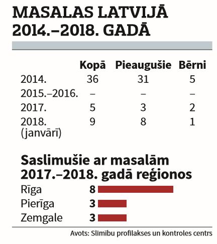 Latvijā ar masalām slimo reti. Pēdējais slimības pacēlums reģistrēts pirms vairākiem gadiem, kad saslima 36 cilvēki, pārsvarā pieaugušie. Šāds slimības pacēlums sācies arī tagad - kopš pagājušā gada decembra epidemiologi reģistrē vienu masalu gadījumu pēc otra, diemžēl arī bērniem. Decembrī laboratoriski apstiprinātas masalas pieciem, šogad janvārī - deviņiem. Pirmie divi saslimušie pērn decembrī bija lidostas darbinieki (visticamāk, tas nozīmē, ka masalas iegūtas no kāda ieceļotāja), arī nākamie saslimušie saistīti ar ceļošanu - saslima divi vienas ģimenes bērni, trīs un sešus gadus veci - ģimene nesen kā bija atgriezusies no ceļojuma uz Taizemi.