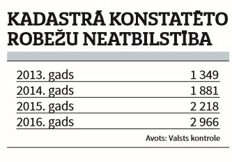 Pārbaudot sūdzības par mērnieku darbu kvalitāti, secināts, ka tās nav bez pamata: 2016. gadā 2966 gadījumos Kadastra datos tika konstatēta robežu neatbilstība. Tas ir divreiz vairāk nekā 2013. gadā, kad šādas neatbilstības tika konstatētas 1349 gadījumos. Valsts zemes dienests mērnieku pieļauto nepilnību dēļ 2016. gadā atteicis reģistrēt 431 jeb 4,5 procentus no visām iesniegtajām kadastrālās uzmērīšanas lietām.