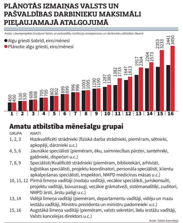 Neatkarīgā jau rakstīja, ka Valsts kanceleja rosinājusi grozīt Valsts un pašvaldību institūciju amatpersonu un darbinieku atlīdzības likumu, palielinot algu griestus no 10. līdz 16. mēnešalgu grupai, tas ir, labāk apmaksātajiem.