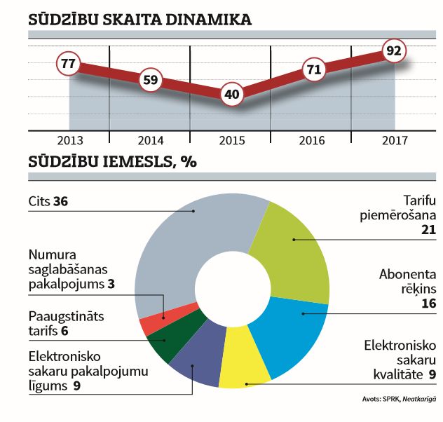 Salīdzinot ar 2016. gadu, SPRK pērn izskatījis par 30% vairāk sūdzību, kas skar elektronisko sakaru pakalpojumu nozari. Salīdzinot ar 2015. gadu, sūdzību skauts ir pieaudzis gandrīz uz pusi. Turklāt jāņem vērā, ka 2017. gadā tika ieviesti precizējumi elektronisko sakaru nozari regulējošos normatīvajos aktos saistībā ar sūdzību iesniegšanas un izskatīšanas kārtību, kas nosaka, ka vispirms lietotājs ar sūdzību vēršas pie sava pakalpojuma sniedzēja un, ja sniegtā atbilde neapmierina vai pakalpojuma sniedzējs nav sniedzis atbildi, tad lietotājs tiesīgs vērsties SPRK. Šī jaunā norma nozīmē, ka lietotāju neapmierinātība ar pakalpojumu sniedzējiem, iespējams, bijusi vēl krietni augstāka.