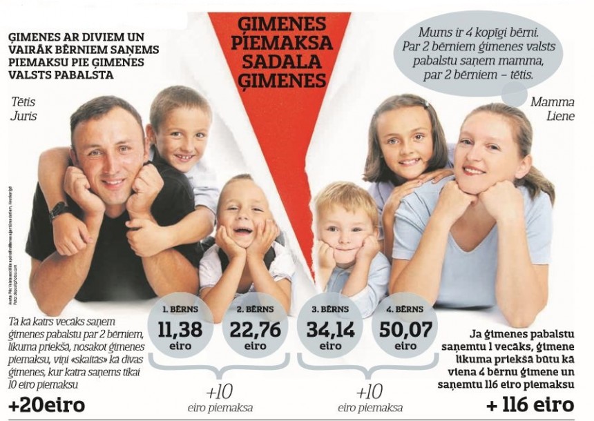 Pēc ilgām politiskām diskusijām pagājušajā gadā Saeima nolēma atbalstīt Latvijas ģimenes nevis ar lielāku ģimenes valsts pabalstu, bet ieviest piemaksu pie pabalsta, kuras apmērs būtu atkarīgs no ģimenē augošo bērnu skaita. Saskaņā ar Valsts sociālo pabalstu likumu no šā gada 1. marta par divu un vairāku bērnu audzināšanu vecākiem pie ģimenes valsts pabalsta Valsts sociālās apdrošināšanas aģentūra (VSAA) piešķir piemaksu. Piemaksas apmērs atkarīgs no bērnu skaita, par kuriem ir piešķirts ģimenes pabalsts konkrētam pabalsta saņēmējam, piemēram, ja pabalsts piešķirts par diviem bērniem - piemaksa pie ģimenes pabalsta būs desmit eiro mēnesī, ja par trīs bērniem - 66 eiro mēnesī.
