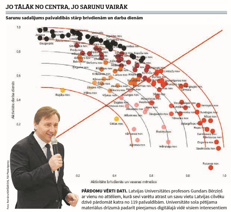 Gan pašiem pētniekiem, gan viņu auditorijai plašākas sabiedrības un sabiedrības pārvaldes līmeņos nācās izvēlēties arī atskaites punktus ārpus datu masīva un meklēt, vai sarunu intensitātes sadalījums nav kaut kādā sakarā ar šiem atskaites punktiem. Varbūt uztveramības atvieglošanas dēļ pētnieki šoreiz koncentrējušies uz sarunu kopējās intensitātes un šīs intensitātes svārstībām gada 12 mēnešos un nedēļas 7 dienās visās 119 Latvijas pašvaldībās. Pēc sarunu intensitātes profiliem tādējādi atpazītas septiņas dažādas pašvaldību grupas un vēl astotā ar nosaukumu «Viļānu fenomens». Grupu nosaukumi veidoti uzsvērti draudzīgi datu lietotājiem. Pirmā grupa ir Darbarūķi - lielās Latvijas pilsētas, daži Pierīgas novadi un vēl Preiļi: sarunu tur kopumā daudz, darbdienās daudz vairāk nekā brīvdienās, vasaras atvaļinājumu laikā jūtami mazāk nekā gada pārējos 10 mēnešos. Otrā grupa ir Harmoniskie - Ventspils, kas ar piesaistītajiem tūristiem vasaras vidū spējusi kompensēt atvaļinājumos aizbraukušos, Pierīgas novadi, Smiltene u.c. Cita grupa - Ballētāji gar visu jūras malu ar Salacgrīvu priekšgalā, bet argumenti piesaistīt cilvēkus vasaras brīvdienās uzrādās arī Tērvetei, Rundālei, Vecpiebalgai u.c. Ir atpazīti Mērenie, kas apdzīvo pusi Latvijas teritorijas, un Apātiskie, kas koncentrējušies gar Latvijas austrumu robežu, bet Viļāni izrādās vienīgā pašvaldība valstī, kas nav pratusi konvertēt sarunu intensitātes pieaugumā pēdējos gados Latvijā nenoliedzami pieaugošo naudas daudzumu un tā apriti.