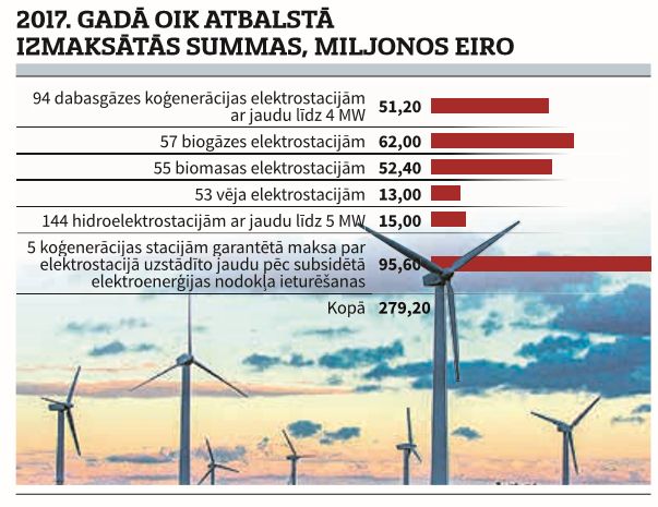 Ekonomikas ministrijas tīmekļa vietnē publicētā informācija par elektroenerģijas obligātā iepirkuma ietvaros komersantiem izmaksātajām summām liecina, ka pērn 403 elektrostacijām kopumā samaksāti 193,60 miljoni eiro un piecām koģenerācijas stacijām izmaksāta garantētā maksa 95,6 miljonu eiro apmērā par elektrostacijā uzstādīto jaudu. Šie aprēķini veikti, atrēķinot subsidētās elektroenerģijas nodokļa ieturēšanu.