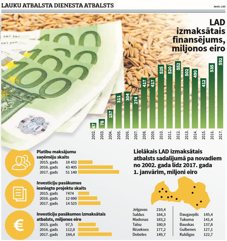 Lauku atbalsta dienests aizvadīto gadu dēvē gan par izrāviena, gan pārbaudījumu gadu. 2017. gadā platību maksājumus saņēma 51 140 lauksaimnieku, kas ir aptuveni 2,5 reizes vairāk nekā 2015. gadā. Aptuveni 95% lauksaimnieku saņēma vienoto platību maksājumu un mazā lauksaimnieka shēmas gala maksājumu līdz gada beigām. Platību maksājumos pērn kopumā izmaksāti 354,1 miljons eiro.