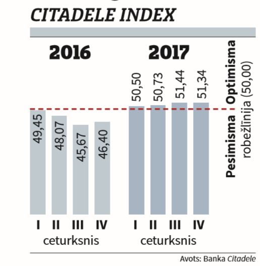 Bankas Citadele ekonomists Mārtiņš Āboliņš atklāj, ka jau ceturto ceturksni pēc kārtas indeksa vērtība pārsniedz 50 punktu robežu, kas tātad liecina par uzņēmēju optimismu. Pēdējā ceturksnī optimistisks noskaņojums bija vērojams visās tautsaimniecības jomās. Vislabāk jūtas ražošanas un būvniecības jomu pārstāvji, bet pakalpojumu un tirdzniecības nozarē strādājošie, lai arī saglabā optimismu, ir piesardzīgāki. Īpaši tas attiecas uz tirdzniecību, kur pēdējā ceturksnī optimisms samazinājies visvairāk.