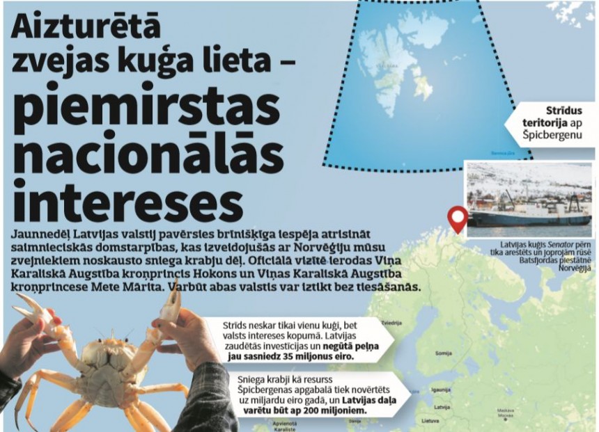 Neatkarīgā jau vēstīja, ka no juridiskā viedokļa norvēģu pozīcija strīdā par krabju zvejas tiesībām ap Špicbergenas arhipelāgu ir vājāka par Eiropas Savienības argumentāciju. Taču norvēģus līdz pēdējam aizstāvēt savu pozīciju liek bažas par citiem resursiem starptautiskajos ūdeņos, proti, zem krabjiem ir nafta, un krabju strīda risinājums var aizvest arī līdz tās - daudz vērtīgākā resursa - taisnīgai sadalei. Tāpēc arī tāds satraukums par 20 krabju zvejas kuģiem no Eiropas Savienības, un tāpēc Latvijas karoga kuģis Senators jau gadu turpina rūsēt arestā mazā norvēģu ostā.