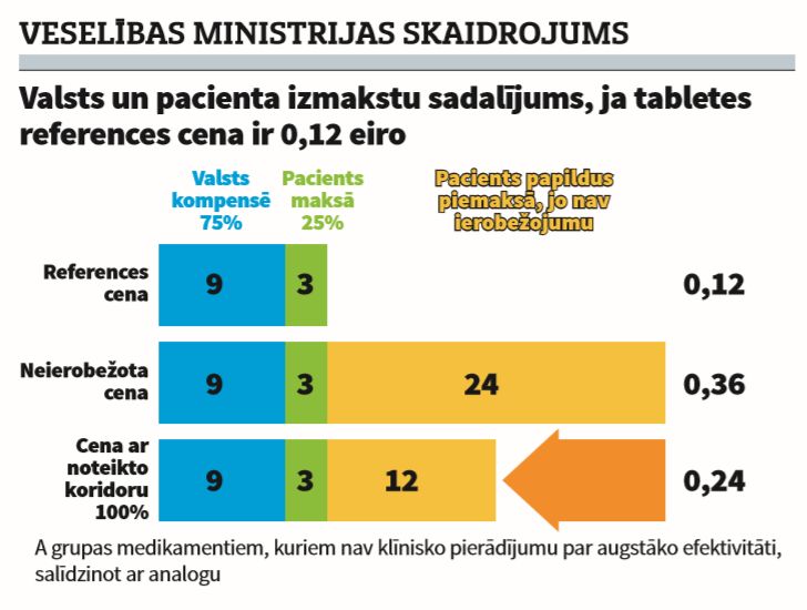 Veselības ministrijas priekšlikums paredz zāļu kompensācijas sistēmā noteikt pieļaujamo cenu koridoru jeb maksimāli pieļaujamās cenu atšķirības līdzvērtīgas efektivitātes zālēm. Pašlaik zāļu kompensācijas sistēmā cena līdzvērtīgas efektivitātes medikamentiem var atšķirties daudzkārt - pat 800 procentu apmērā. Ja pacientam ir nozīmēts dārgāks medikaments - cits, nevis lētākais līdzvērtīgas efektivitātes medikaments, pacients ievērojami pārmaksā par zālēm. Kā piemēru Veselības ministrija izmanto medikamentu x, kura vienas tabletes cena ir 12 eirocenti, bet valsts kompensē 75 procentus no references (lētākā) medikamenta cenas. Lētākā medikamenta gadījumā pacients samaksā tikai 25 procentus pacienta līdzmaksājumu, kas ir trīs eirocenti, bet valsts kompensē deviņus centus, savukārt, ja pacientam ir izrakstīts cits medikaments, valsts samaksā tos pašus deviņus centus, pacienta līdzmaksājums ir trīs centi, bet vēl jāmaksā atlikusī summa par medikamenta cenu (piemērā tie ir vēl papildu 24 centi). Pēc Veselības ministrijas aprēķiniem, visvairāk šādi pacienti maksā par zālēm sirds un asinsrites slimību ārstēšanā, kā arī par ādas slimību zālēm. 2017. gadā pacienti, iegādājoties nereferences medikamentus, samaksājuši 25 miljonus eiro, norāda Veselības ministrija.