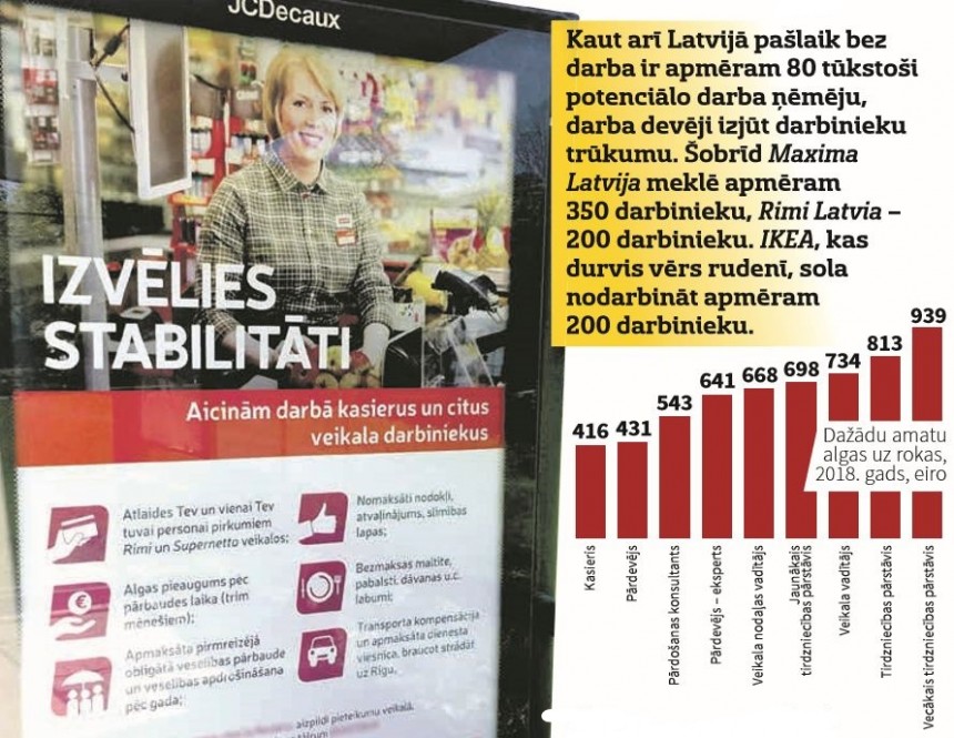 Kaut arī Latvijā pašlaik bez darba ir apmēram 80 tūkstoši potenciālo darba ņēmēju, darba devēji izjūt darbinieku trūkumu. Šobrīd Maxima Latvija meklē apmēram 350 darbinieku, Rimi Latvia – 200 darbinieku. IKEA, kas durvis vērs rudenī, sola nodarbināt apmēram 200 darbinieku.
