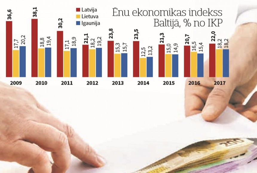 Rīgas Ekonomikas augstskolas Ēnu ekonomikas indeksa Baltijas valstīs rezultāti gan liecina, ka ēnu ekonomika augusi arī Lietuvā un Igaunijā, turklāt straujāk, tomēr Latvijā tās īpatsvars ir vislielākais - 22 procenti no iekšzemes kopprodukta (IKP).