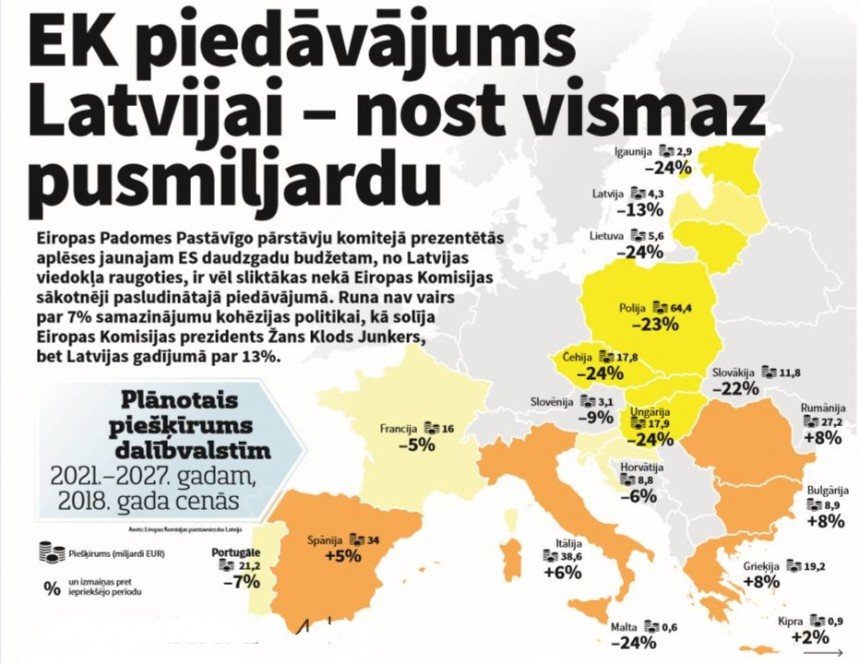 Eiropas Padomes Pastāvīgo pārstāvju komitejā (COREPER) prezentētās aplēses jaunajam ES daudzgadu budžetam, no Latvijas viedokļa raugoties, ir vēl sliktākas nekā Eiropas Komisijas sākotnēji pasludinātajā piedāvājumā. Runa nav vairs par 7% samazinājumu kohēzijas politikai, kā solīja Eiropas Komisijas prezidents Žans Klods Junkers, bet Latvijas gadījumā par 13%.