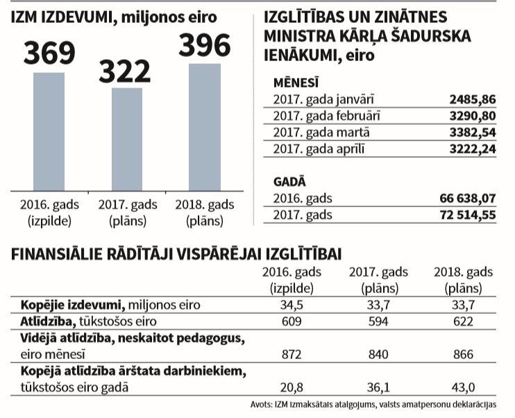 Izglītības un zinātnes ministra Kārļa Šadurska alga uz papīra ir 4020 eiro - tikpat, cik citiem ministriem. Un līdzīgi kā visām amatpersonām, kurām alga mainās līdz ar vidējās algas izmaiņām valstī, arī K. Šadurskim šis gads nesis algas palielinājumu. Ministriem algas palielinājums mērāms 192 eiro apmērā uz papīra. Nauda, ko ministriem izmaksā uz rokas (pareizāk sakot, pārskaita uz bankas kontu), ir atkarīga no apgādājamo skaita, piemaksām u.tml. K. Šadurskis par darbu decembrī uz rokas saņēma 2485 eiro, par darbu martā - 3222,24 eiro uz rokas.