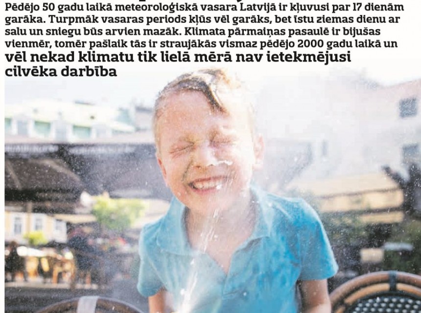 Pēdējo 50 gadu laikā meteoroloģiskā vasara Latvijā ir kļuvusi par 17 dienām garāka. Turpmāk vasaras periods kļūs vēl garāks, bet īstu ziemas dienu ar salu un sniegu būs arvien mazāk. Klimata pārmaiņas pasaulē ir bijušas vienmēr, tomēr pašlaik tās ir straujākās vismaz pēdējo 2000 gadu laikā un vēl nekad klimatu tik lielā mērā nav ietekmējusi cilvēka darbība, konstatēts VSIA Latvijas Vides, ģeoloģijas un meteoroloģijas centrs (LVĢMC) pētījumā par klimata pārmaiņām – jau notikušajām un prognozējamām.