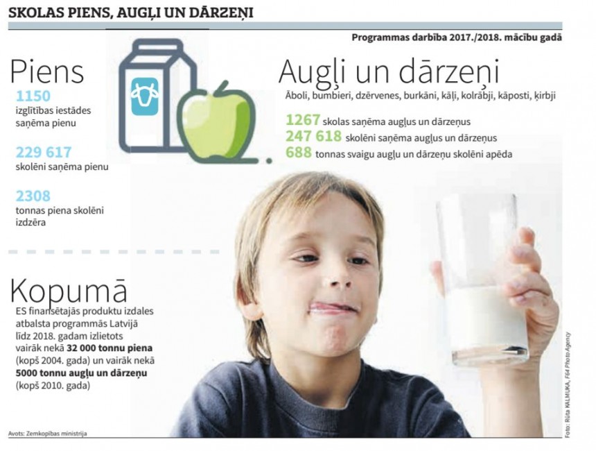 Lauku atbalsta dienests apkopojis provizoriskos datus par atbalsta programmas darbību pagājušajā mācību gadā. No visām skolām, kuras iesaistījās programmā, augļus un dārzeņus izdalīja 1267 skolas, bet pienu - 1150 mācību iestādes. Šajās skolās bezmaksas augļus un dārzeņus saņēma 247 600 skolēnu, kas ir 89,8 procenti no visiem bērniem, bet pienu - 229 600 audzēkņu (83,3 procenti). Zemkopības ministrija atgādina, ka no 2004./2005. mācību gada līdz 2016./2017. mācību gadam Latvijā tika īstenota programma Skolas piens, savukārt no 2010./2011. mācību gada līdz 2016./2017. mācību gadam - Augļi skolai. Pagājušajā mācību gadā darbību sāka jaunā vienotā Eiropas augļu, dārzeņu un piena programma skolām. Šajā laikā, kopš šī programma Latvijā darbojas, izlietots vairāk nekā 32 000 tonnu piena un tā produktu un vairāk nekā 5000 tonnu augļu un dārzeņu kopumā par 29,4 miljoniem eiro.