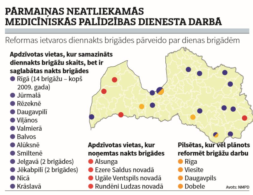 NMP dienesta dati rāda, ka tādas vietas, kur naktī uz vietas vairs nav ātrās palīdzības brigādes, ir četras pagastu vai novadu centri - Alsunga, par ko Neatkarīgā rakstīja jau vakar, Rundēni, Ezere un Ugāle. Kopumā Neatkarīgā izpētīja, ka pārmaiņas skar 17 apdzīvotas vietas un nakts brigāžu skaits ir mazāks par 32 brigādēm (tiesa, dienests skaidro, ka atsevišķās vietās, piemēram, Rīgā šīs pārmaiņas norit jau no 2009. gada un nemaz neesot saistītas ar šā gada reformu...). Izmaiņas notiks dienesta darbā Rīgā, Viesītē, Daugavpilī un Dobelē, kur līdz gada beigām tiks pārveidotas vēl četras brigādes.
