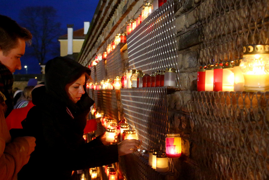 Nolikt piemiņas svecītes ieradušies dažāda gadagājuma cilvēki, tostarp daudz ģimeņu ar bērniem.