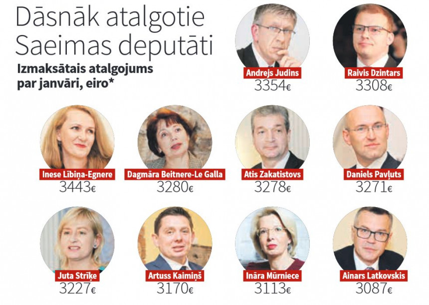 Visiem Saeimas deputātiem kopā atalgojumā par janvāri izmaksāti 217 774 eiro uz rokas. Visdāsnāko atlīdzību saņēmis Pilsonības, migrācijas un sabiedrības saliedētības komisijas priekšsēdētājs un Jaunās Vienotības Saeimas frakcijas vadītāja vietnieks Andrejs Judins - 3354 eiro.