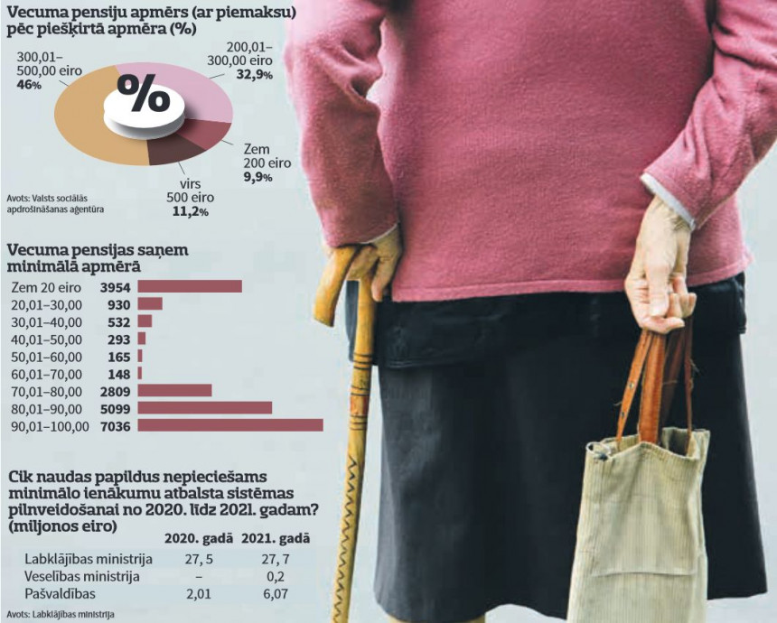 «Valsts sociālā nodrošinājuma pabalsta palielināšana pozitīvi ietekmēs aptuveni 11 000 valsts iedzīvotāju, bet minimālo valsts pensiju aprēķina bāzes palielināšana pozitīvi ietekmēs aptuveni 71 000 valsts iedzīvotāju, tajā skaitā vecuma pensiju saņēmējus, invaliditātes pensiju saņēmējus, apgādnieka zaudējuma pensijas saņēmējus un izdienas pensiju saņēmējus,» ministrijas aprēķinus komentē E. Celmiņa. Vēl virkne pasākumu plānoti 2021. gadā, piemēram, palielināt trūcīgas personas ienākuma līmeni līdz 198 eiro jeb 40 procentu no ienākumu mediānas pirmajai personai mājsaimniecībā (jāatgādina, ka visa koncepcija piedāvā ieviest citu skatījumu uz minimālajiem ienākumiem, nabadzību).