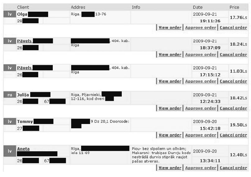 "Picu – bez sīpoliem un olīvām; Makaroni – trubiņas. Durvju kods nestrādā, durvis, stiprāk raujot, pašas atveras," rakstīts vienā no internetā publicētajiem pasūtījumiem. Turpat atrodams arī pasūtītāja vārds, uzvārds, tālruņa numurs, adrese, pasūtījuma laiks un cena. Līdzīgi kā šis, arī daudzi citi pasūtījumi vakar no rīta bija pieejami restorānu tīkla CanCan mājas lapā. Ikviens interesents varēja iegūt informāciju par visiem pasūtījumiem vairāku gadu garumā.