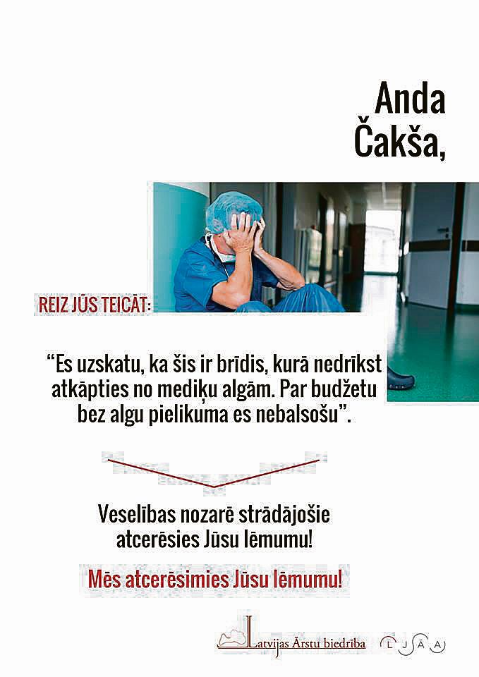 Protestējot pret politiķu liekulību, Ārstu biedrība un jaunie ārsti ir nosūtījuši vēstules visiem Saeimas deputātiem, atgādinot partiju programmās rakstīto un solīto. Jaunie ārsti apkopojuši visu Saeimā pārstāvēto partiju programmās ierakstītās apņemšanās, kā arī atsevišķu deputātu publiski solīto. Šīs akcijas mērķis ir katram deputātam personīgi atgādināt par viņa pienākumu rūpēties par Latvijas valsts un nācijas ilgtspēju, tālredzīgi un saprātīgi rīkojoties ar nodokļu maksātāju līdzekļiem.