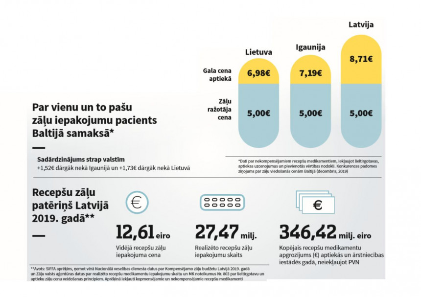 Apkopojot Nacionālā veselības dienesta un Valsts zāļu aģentūras pieejamo informāciju par recepšu zāļu patēriņu Latvijā, Starptautisko inovatīvo farmaceitisko firmu asociācija secinājusi, ka 2019. gadā recepšu medikamentu apgrozījums aptiekās un ārstniecības iestādēs Latvijā sasniedza 346,43 miljonus eiro (neiekļaujot pievienotās vērtības nodokli). Kopējais realizēto recepšu zāļu iepakojumu skaits pērn sasniedzis 27,47 miljonus. Aprēķini liecina, ka vidējā viena recepšu zāļu iepakojuma cena aptiekās un ārstniecības iestādēs bijusi 12,61 eiro, neiekļaujot nodokli. Šo cenu veidojusi zāļu ražotāju vidējā cena 8,45 eiro apmērā un aptieku un lieltirgotavu piecenojums, kas vidēji ir 4,16 eiro, apliecinot, ka aptuveni vienu trešdaļu no zāļu cenas pacients samaksā tikai uzcenojumos. Asociācija, aprēķinot kopējo vidējo aptieku un lieltirgotavu uzcenojumu pret zāļu pašizmaksu jeb ražotāja cenu, secinājusi, ka pacienti, iegādājoties recepšu zāles aptiekās, gada laikā lieltirgotavu un aptieku uzcenojumos ir samaksājuši 114,3 miljonus jeb 49,24 procentus pret zāļu pašizmaksu.