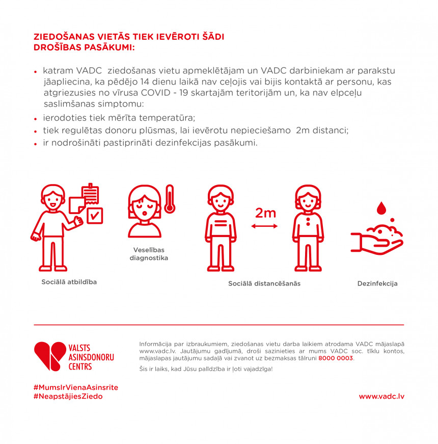 VADC aicina donorus ziedot asinis kādā no pastāvīgajām asins ziedošanas vietām vai izbraukumos. Visās ziedošanas vietās tiek ievēroti pastiprināti piesardzības pasākumi, lai garantētu drošu vidi. VADC prioritāte šajā sarežģītajā periodā ir rūpēties gan par VADC personāla, gan donoru drošību, kā arī nodrošināt drošus asins komponentus slimnīcām.
