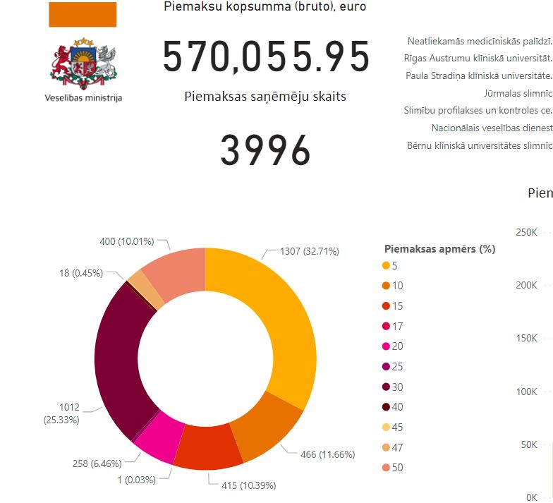 Lielākais skaits piemaksu par darbu ārkārtas apstākļos izmaksāts Neatliekamās medicīniskās palīdzības dienestā un Rīgas Austrumu slimnīcā, bet piemaksas saņēmuši arī Veselības ministrijas, Nacionālā veselības dienesta un Slimību profilakses un kontroles centra darbinieki.