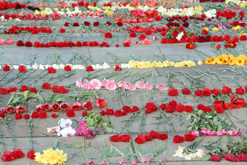 Atzīmējot tā dēvēto "Uzvaras dienu", šorīt cilvēki aktīvi pie Uzvaras pieminekļa Rīgā individuāli noliek ziedus.