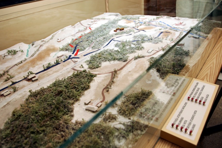 "Tas ir shematisks makets, kurā ar bultām norādīti kauju virzieni, ar gaismas diodēm atzīmētas konkrētas vietas, piemēram, mājas. Makets rada pārskatu, sapratni par konkrēto kauju, jo daudziem nav zināšanu, kā un kāpēc ir karojis O. Kalpaks," Neatkarīgajai stāsta R. Valters.