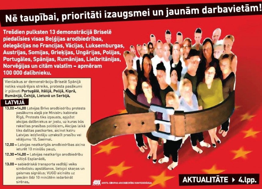 "Prasām mūs nejaukt kopā ar partiju aktivitātēm un no tām norobežojamies," uzsver Latvijas Brīvo arodbiedrību savienības (LBAS) priekšsēdētāja vietniece Līvija Marcinkēviča. Jau rīt ar strādājošajiem citās Eiropas valstīs Rīcības dienā solidarizēsies arī LBAS un Latvijas neatkarīgās arodbiedrības.