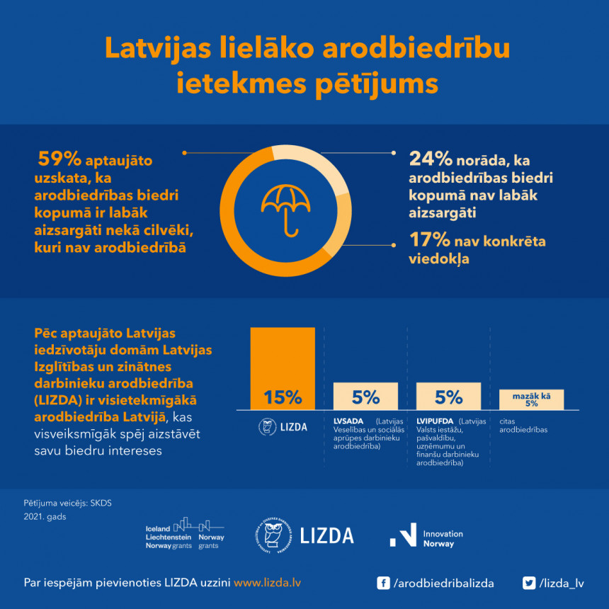 Pētījuma dati liecina: vairāk kā puse (59%) aptaujāto uzskata, ka arodbiedrības biedri kopumā ir labāk aizsargāti nekā cilvēki, kuri nav arodbiedrībā (45% — drīzāk ir labāk aizsargāti, 14% — noteikti ir labāk aizsargāti), savukārt ceturtā daļa aptaujāto (24%) norāda, ka arodbiedrības biedri kopumā nav labāk aizsargāti. 17% nav konkrēta viedokļa šajā jautājumā.