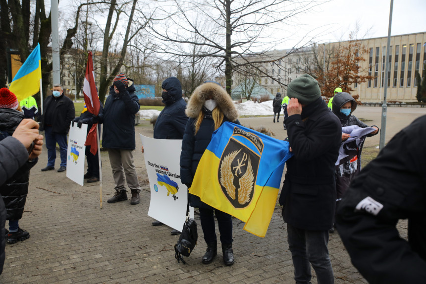 Rīgā pie Krievijas vēstniecības pulcējās cilvēki, kas pauda atbalstu Ukrainas teritoriālajai vienotībai, kā arī nosodīja Krievijas rīcību.