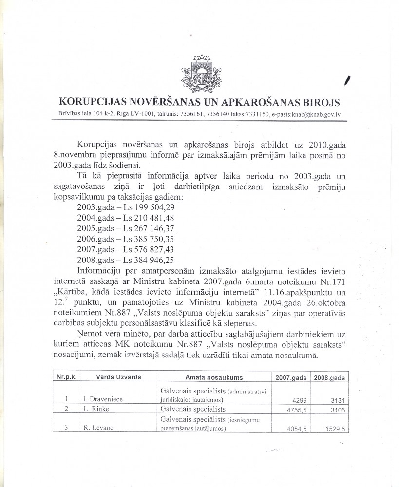 No 2003. gada līdz 2008. gadam KNAB darbiniekiem izmaksātas vairāk nekā divu miljonu latu prēmijas, liecina KNAB finanšu atskaites.