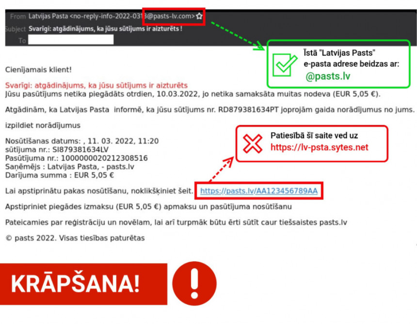 Krāpnieki e-pastā aicina iedzīvotājus veikt piegādes apmaksu par kādu aizkavētu sūtījumu, un norādītā apmaksas saite ved uz viltus vietni, kas domāta norēķinu kartes datu izkrāpšanai.