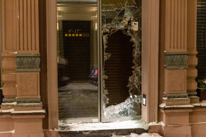 Pie bankas ēkas šovakar stāvēja vairākas policijas automašīnas. Ieejas durvis ir izsistas, ēkas augšējo stāvu logos deg gaisma, novēroja aģentūra LETA.