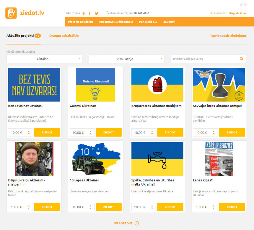 Kopš Krievijas iebrukuma Ukrainā Latvijas iedzīvotāji un uzņēmumi Ukrainas atbalstam vidēji katru dienu ziedojuši 104 tūkstošus eiro (kopā saziedoti 38 miljoni eiro). Līdztekus naudas ziedojumiem, radušās daudzas jaunas pilsoniskās iniciatīvas un organizācijas, kas sniedz palīdzību Ukrainai. Aicinām turpināt atbalstīt Ukrainas tautu – ziedot.lv/ukrainai