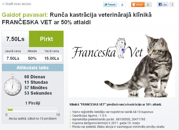 Taču izrādās, ka ar atlaidēm interneta vidē nu jau tiek piedāvāti ne vien ziedi, masāžas un aerobikas nodarbības, bet arī tāda daudz specefiskāka lieta, kā, piemēram kaķa kastrācija.