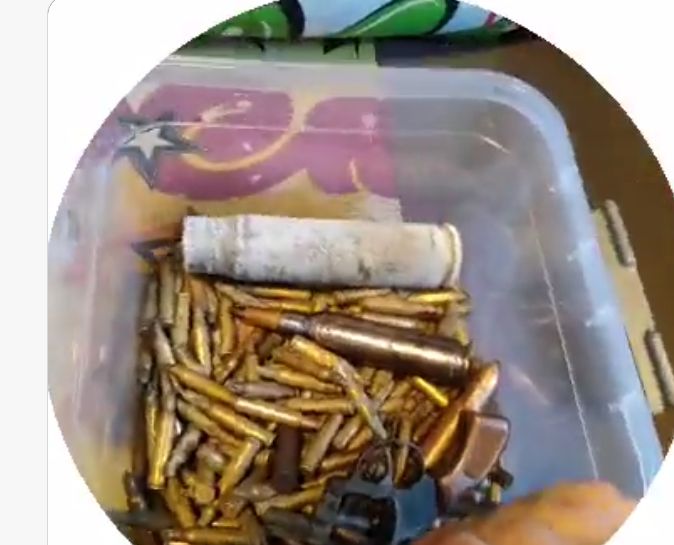 Video arī redzams, kā zēns iebāž roku plastmasas kastē, kurā atrodas čaulītes un, iespējams, mācību munīcija.